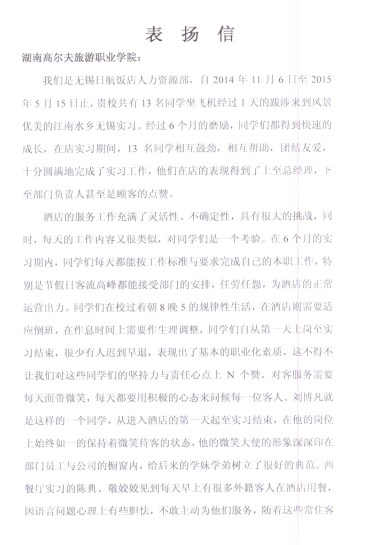 湖南宾馆对我系实习生表彰通报